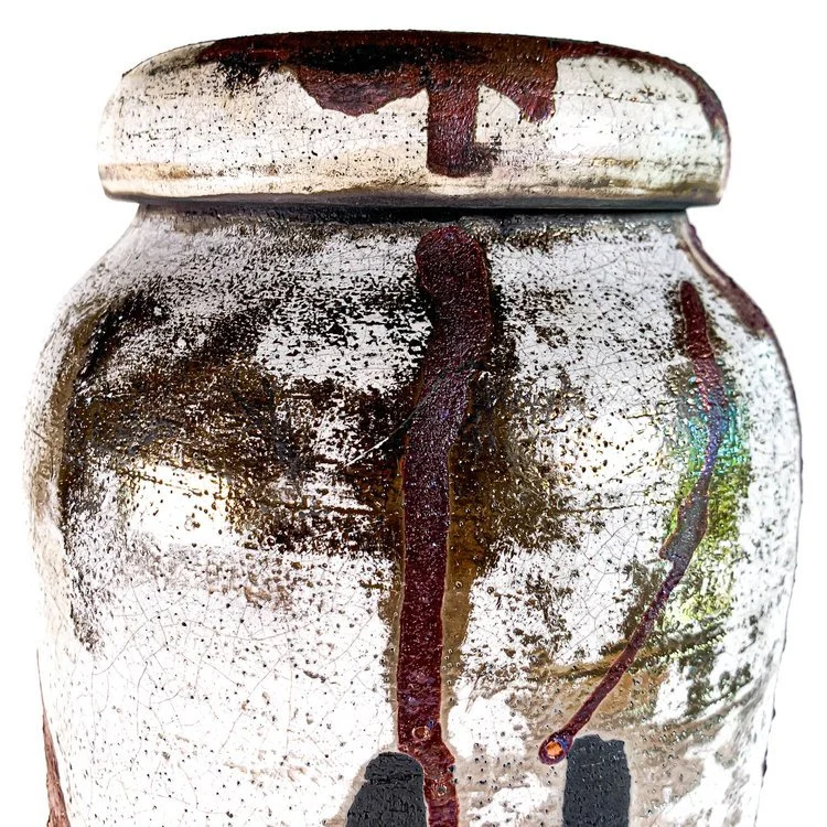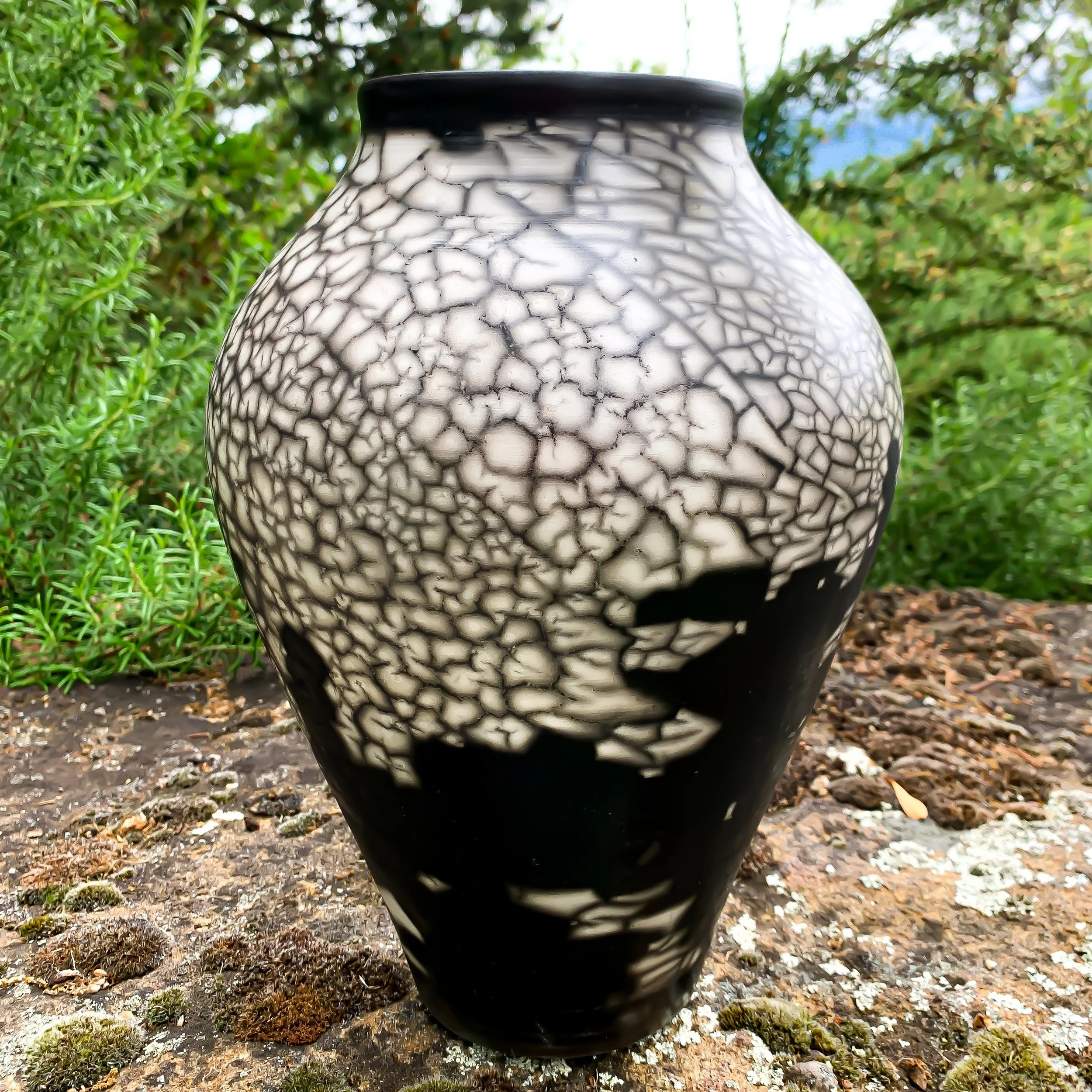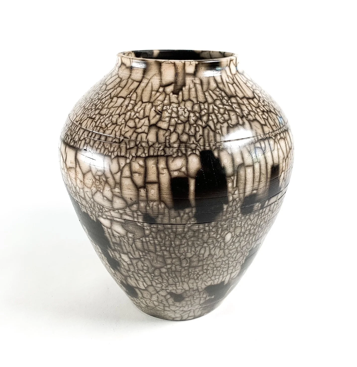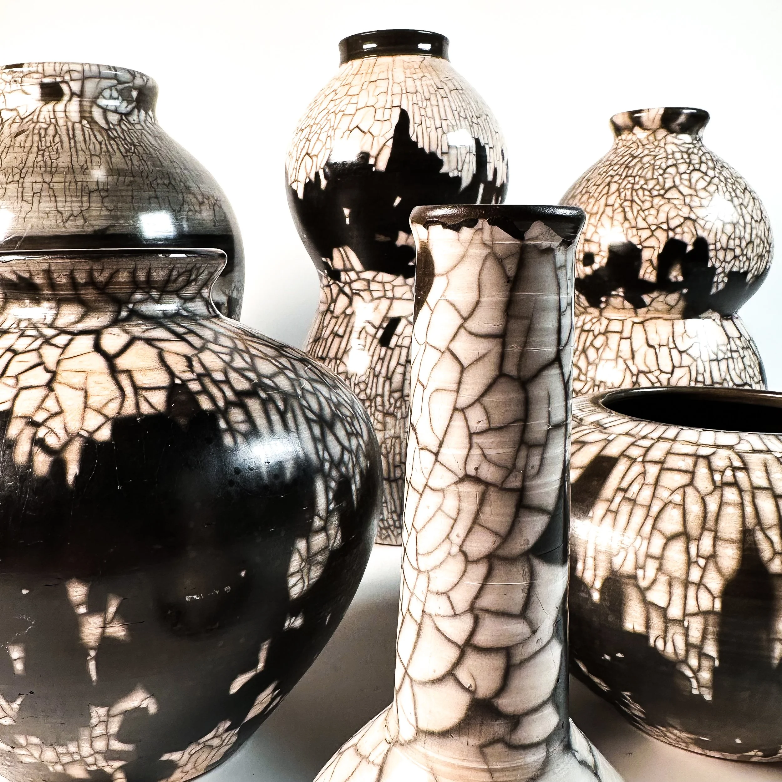 Raku firing is an unpredictable process, moving pieces through extreme temperature changes to produce one-of-a-kind surface effects. I work with techniques including Obvara, Naked Raku, and Raku glaze, each offering its own visual character. Because the results can’t be replicated, every piece carries its own distinct story.